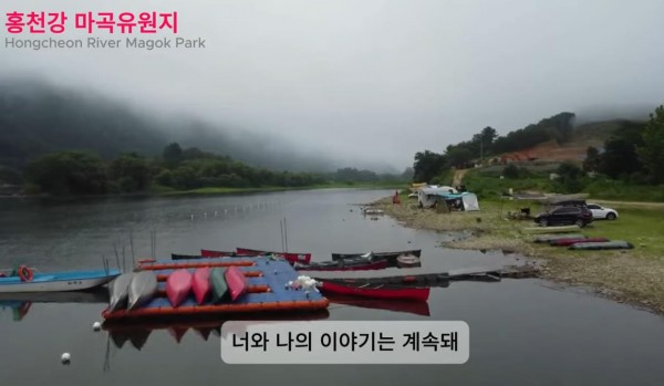 강변 뷰: 텐트나 차박 자리에서 바로 홍천강을 바라보며 힐링할 수 있습니다.